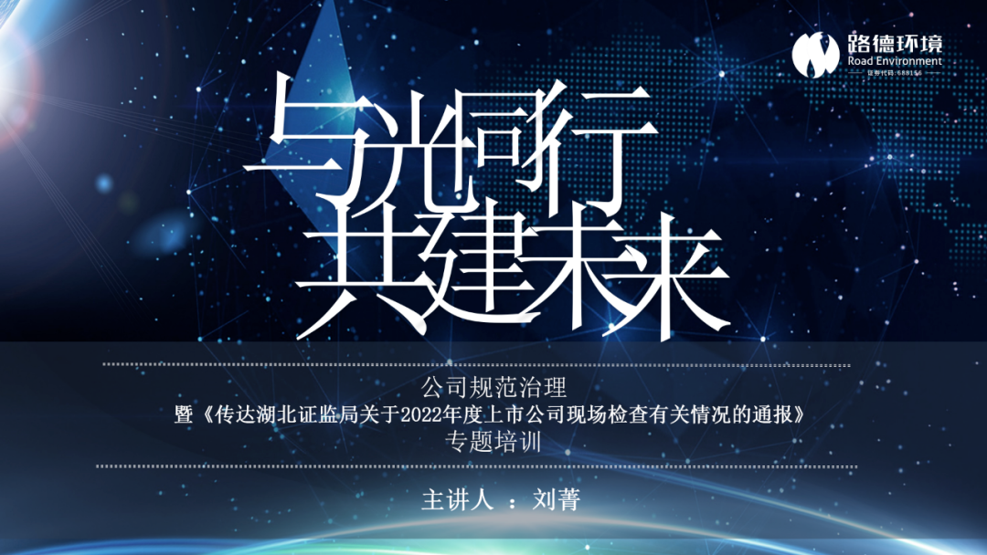 2月25日,为响应湖北证监局“进一步提升辖区上市公司规范运作水平,推动高质量发展”的号召,路德环境召开了“公司规范治理暨《传达湖北证监局关于2022年度上市公司现场检查有关情况的通报》专题培训”活动。 公司规范治理专题培训活动 此次培训,由公司副总经理、董事会秘书刘菁担任主讲。刘菁向与会人员科普了上市公司监管体系,同时围绕湖北证监局2022年度上市公司现场检查中所发现的九大问题,配合具体的市场案例一一进行分析和讲解,并结合公司自身情况进行自查自纠,对公司各部门下一步规范运作提出了新的要求。 详细讲解+案例