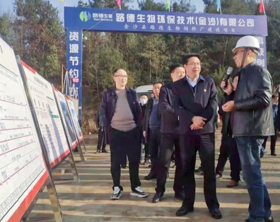 路德生物环保技术(金沙)有限公司总经理聂万胜向参加调研的领导们介绍了项目的背景意义、建设规模、工期安排等。聂万胜介绍,路德环境白酒糟生物发酵饲料,是利用金沙当地特有的优质酱香型白酒糟作为发酵培养基,通过现代微生物固态发酵、连续多级低温干燥等技术工艺,实现白糟渣的综合处置及资源化利用。产品倍肽德作为功能性饲料原料兼具营养、功能特性,既能替代一部分蛋白类饲料原料,实现节粮养殖;又能提升动物机体免疫力,减少或替代抗生素等药物,符合减抗限抗养殖要求。产品目前供不应求,主要供应给新希望六和、蒙牛、伊利、现代牧业等国内头部饲料加工企业和龙头养殖企业。