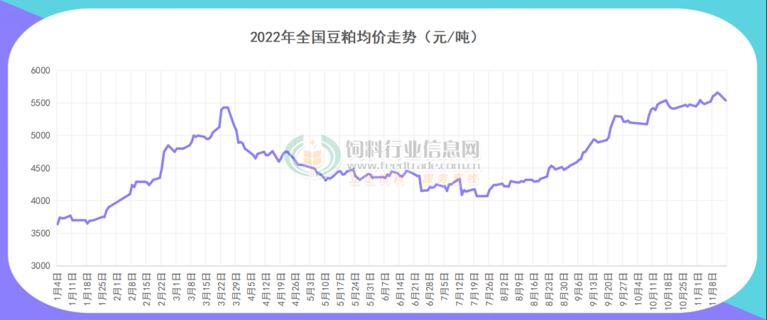 11月10日,中国饲料行业信息网公布数据显示:上周,豆粕现货价格经连续四天的上涨之后创下年内新高,全国均价已超过5600元/吨,直逼6000元大关而去。