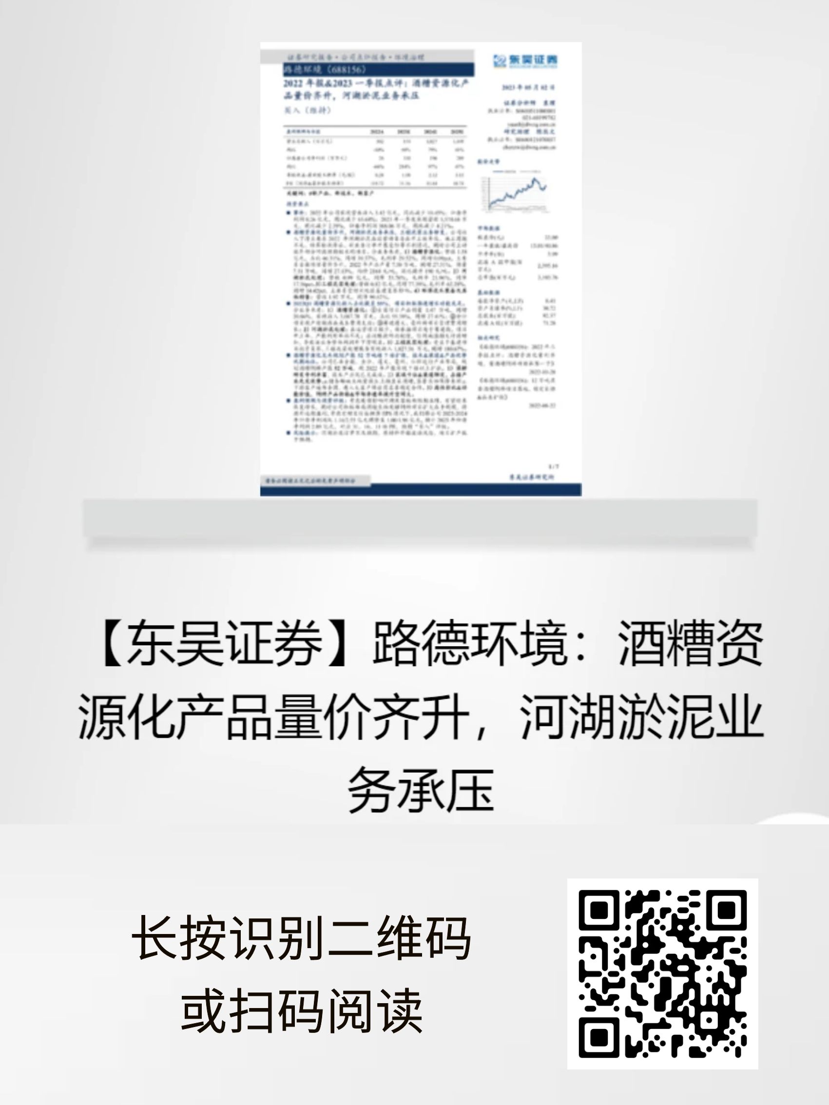 【点评报告】东吴证券点评路德环境:酒糟资源化产品量价齐升,河湖淤泥业务承压