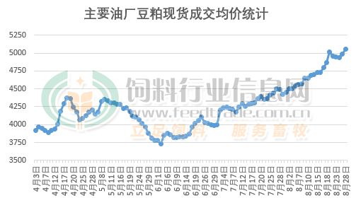 据饲料行业信息网数据显示:8月28日,国内豆粕市场均价突破5000元/吨大关,创下了自6月份触底反弹以来的新高。