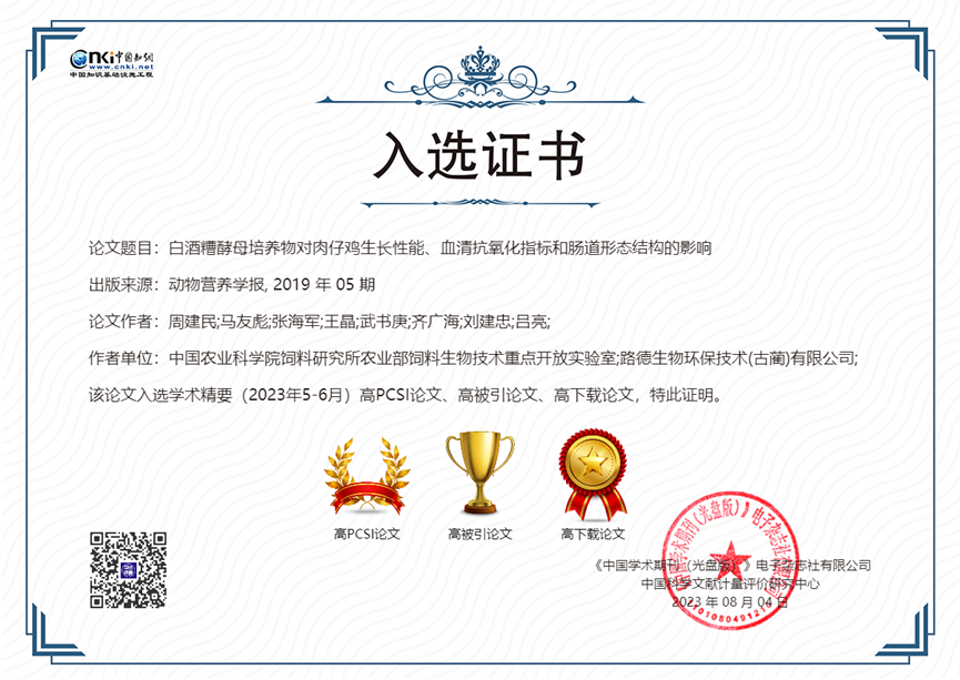 公司与中国农业科学院饲料研究所家禽营养与饲料创新团队共同完成并发表于《动物营养学报》(2019,31(5): 2357-2366)的学术论文—《白酒糟酵母培养物对肉仔鸡生长性能、血清抗氧化指标和肠道形态结构的影响》,入选2022年度“领跑者5000—中国精品科技期刊顶尖学术论文(F5000)”和学术精要(2023年5-6月)高PCSI论文、高被引论文和高下载论文。