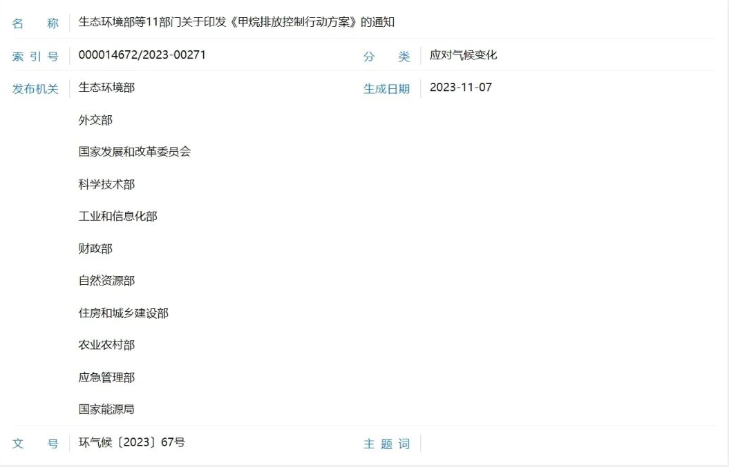 11月7日,生态环境部等11部门联合印发《甲烷排放控制行动方案》的通知,这是我国开展甲烷排放管理控制的顶层设计文件,明确提出了“十四五”和“十五五”期间甲烷排放控制目标。