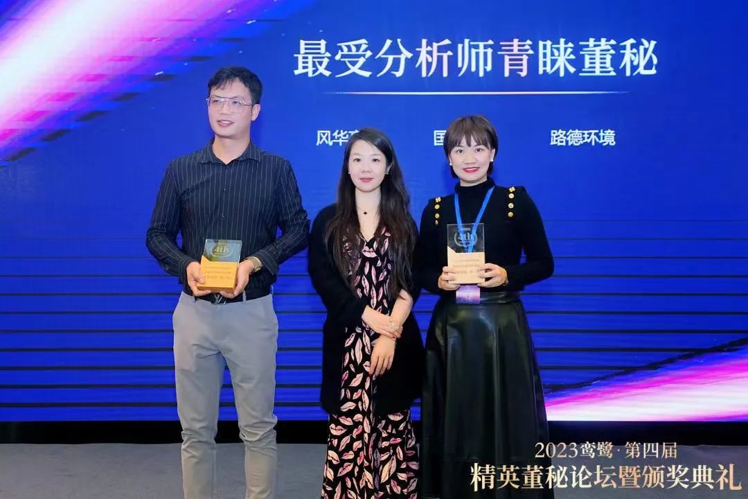 会上,“第四届精英董秘评选”榜单揭晓,路德环境副总经理、董事会秘书刘菁女士荣获“最受分析师青睐董秘”奖项。