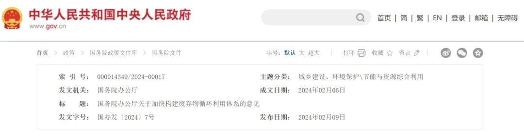 春节前夕,国务院办公厅发布《关于加快构建废弃物循环利用体系的意见(点击阅读政策原文)》(国办发〔2024〕7号,以下简称《意见》)。