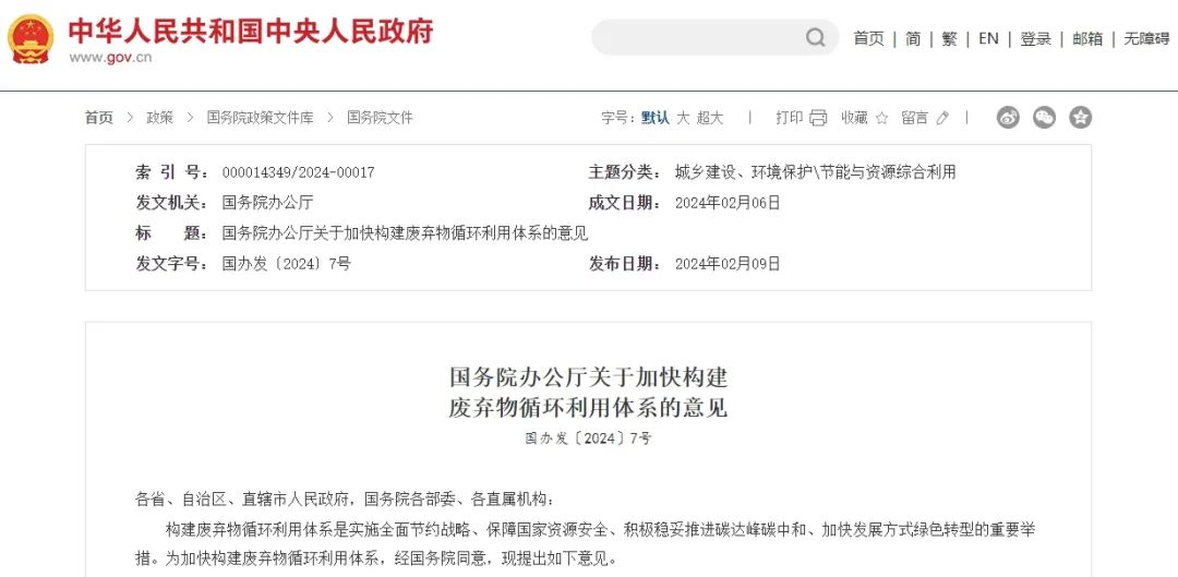 事实上,政府工作报告并不是唯一的信号。早在今年2月9日,国务院办公厅印发《关于加快构建废弃物循环利用体系的意见》(下称《意见》),就透露出一些与众不同的信号。