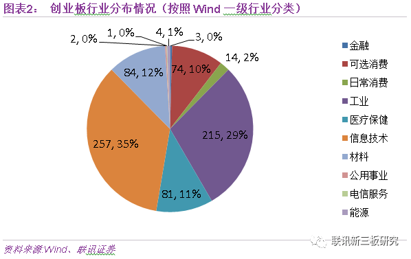 从行业看来,尽管创业板上大多数公司都是创业板市场成立之初,证监会并没有对创业板市场内的行业分布进行细分,也没有对行业进行要求,只是提出在创业板市场上市的公司要符合“两高六新”的特点:“两高”是指成长性高、科技含量高;“六新”指的是新经济、新服务、新农业、新材料、新能源和新商业模式。2010年3月,证监会发布《关于进一步做好创业板推荐工作的指引》又提出,应重点推荐国家战略性新兴产业发展方向的企业在创业板市场上市,特别是新能源、新材料、信息等领域的企业,以及其它领域中具有创新能力和成长性较强的企业。