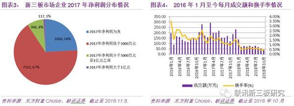 业绩方面,以截止至2018年11月8日尚处于挂牌中并公布2017年报的10784家企业为例,近70%的企业净利润低于3000万元,为中小型企业;甚至出现24%的企业2017年处于亏损状态。流动性方面,2018年以来新三板市场的流动性急剧下降,月换手率不足1%,月成交额不足百亿元。