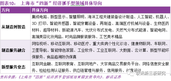 2015年,《上海市“四新”经济抓手型领域培育跟发展导向》对“四新经济”具体要求进行了明确和细化,中确立了三类“抓手型行业”,分别是20个从制造到智造的重点方向、14个制造服务融合的先进方向、9个新型服务业态。