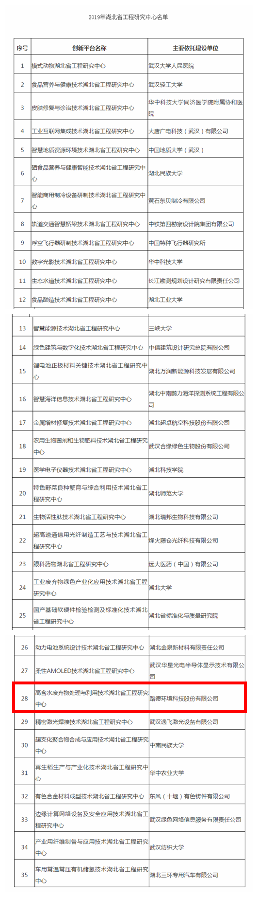 热烈祝贺路德环境科技股份公司于2019年9月获评“高含水废弃物处理与利用技术湖北省工程研究中心”,同期入选的还有武汉大学、华中农业大学等高等院校及科研院所。 获评该中心是对公司数十年创新能力及研究成果的极大肯定,为我公司跨界水利、市政、环保、微生物等领域进行研发储备提供了坚实的平台条件。 “湖北省工程研究中心”是湖北省发改委为加快构建完善区域创新体系,提升我省战略性新兴产业和优势特色领域核心竞争力和可持续发展能力。此平台要求企业具有主持省级及以上重点科研项目的经历,具备良好的产学研合作基础,拥有一批具有自主知识产权、有待工程化开发、技术含量高和市场前景好的科技成果和技术储备;以及先进的研发试验基础设施配套条件和较高水平的研究开发和技术集成能力及相应的人才队伍。