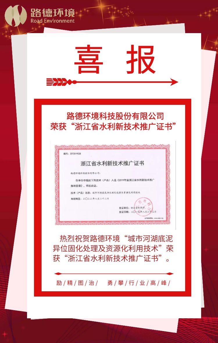 热烈祝贺路德环境科技股份有限公司荣获“浙江省水利新技术推广证书”