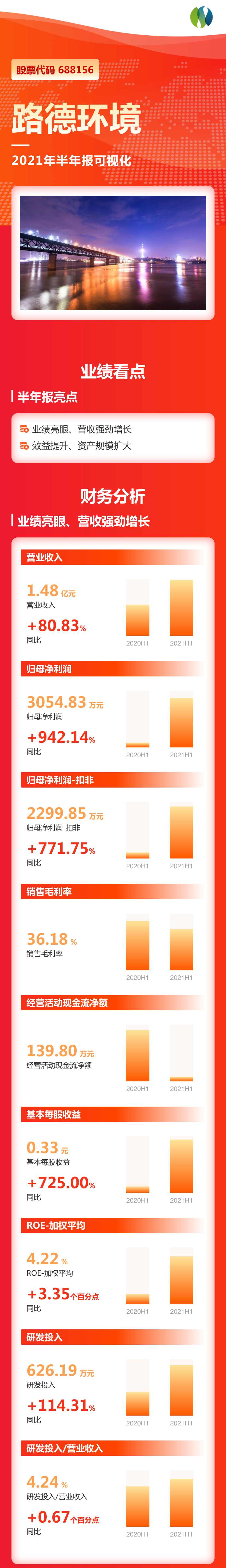8月19日,路德环境发布2021年半年报,上半年,公司实现营业收入14785.15万元,同比增长80.83%;归属于上市公司股东的净利润3054.83万元,同比增长942.14%。